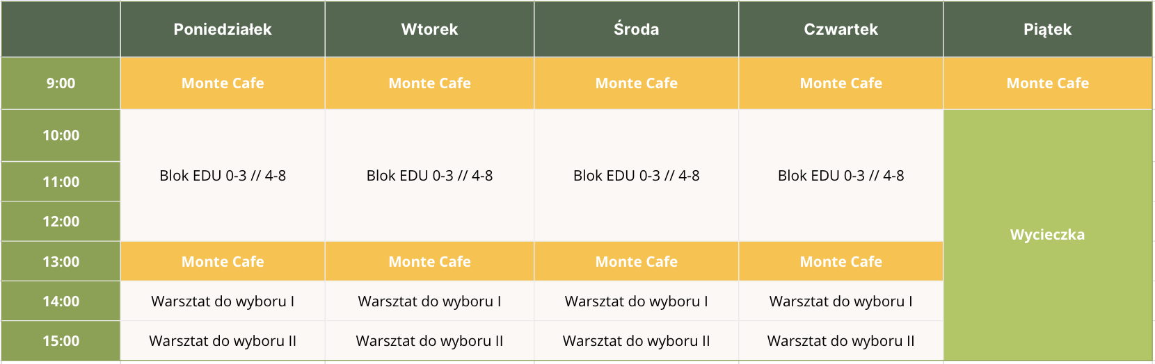– dni zajęć w przestrzeni Montessori City Academy od poniedziałku do czwartku